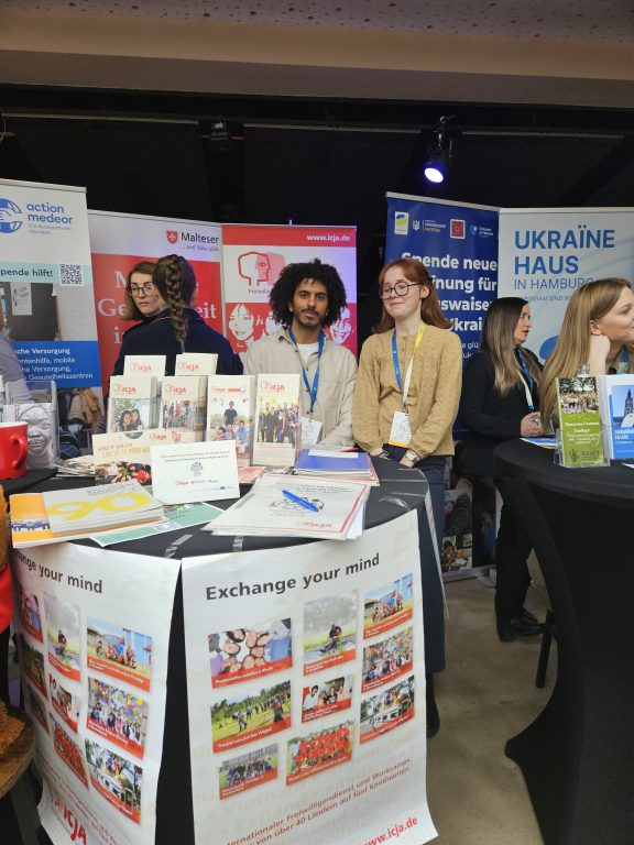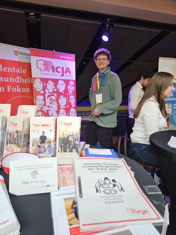 ICJA and the project took part in the Cafe Kyiv event in Berlin. It was a large event with around 3,000 people, where many initiatives, organisations and companies presented their projects with and about Ukraine and Ukrainian people and exchanged ideas. There were many panels and lectures on a wide range of topics (from resilience, youth empowerment, reconstruction, discussions about weapons deliveries, Ukrainians in Germany, and much more). Four of our Young Leaders for Change were present, providing support and engaging in conversations with visitors. There was a great deal of exciting exchange and interest in our project. Many thanks to everyone involved! for more Information: https://cafekyiv.kas.de/